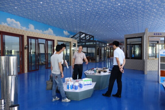 (吳經(jīng)理在全國最大門窗體驗(yàn)中心向貴賓介紹奮安門窗配件)